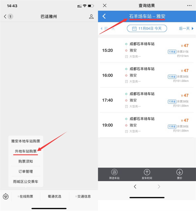 11月4日,蜀通公司線上購(gòu)票平臺(tái)“巴適雅州”微信公眾號(hào)開通省內(nèi)外多地區(qū)汽車購(gòu)票業(yè)務(wù)。