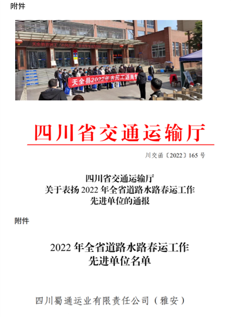 蜀通公司認(rèn)真落實各級政府和行業(yè)主管部門有關(guān)春運工作的安排部署,堅持以“冬安行動”為抓手,全力以赴做好春運期間運輸安全和疫情防控,確保全市交通運輸暢通、民生出行順利。2022年春運期間,共投入班線車輛16546臺,發(fā)班21269班次,其中加班422班次,安全運送旅客26余萬人次,圓滿完成2022年春運工作,被四川省交通運輸廳評為“2022年全省道路水路春運工作先進(jìn)單位”。