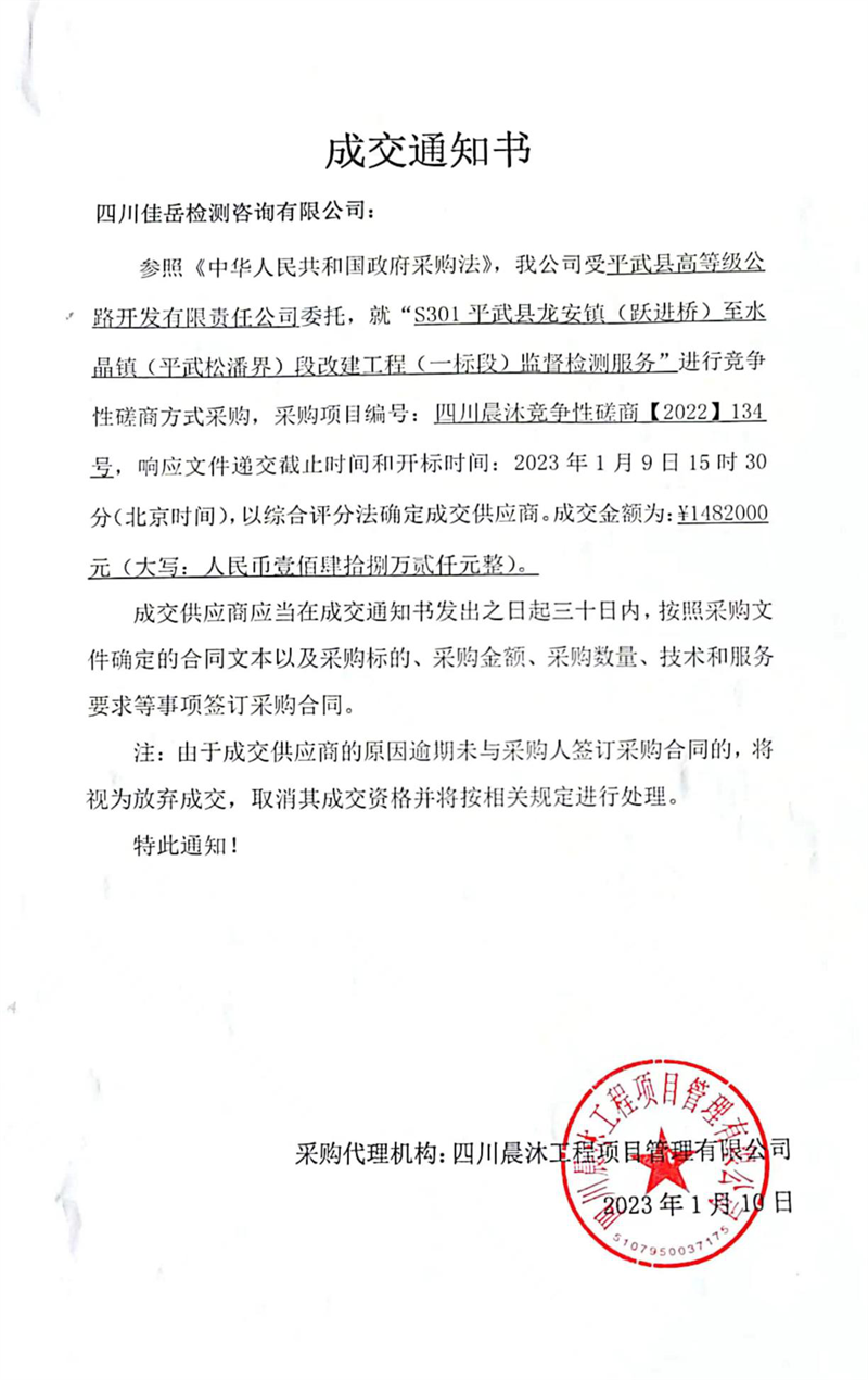 開門紅,月月紅。2023新春來臨之際,1月10日,雅安交建集團四川佳岳檢測咨詢有限公司中標(biāo)新年度首個市外檢測項目,為實現(xiàn)“開門紅”奠定了基礎(chǔ)。