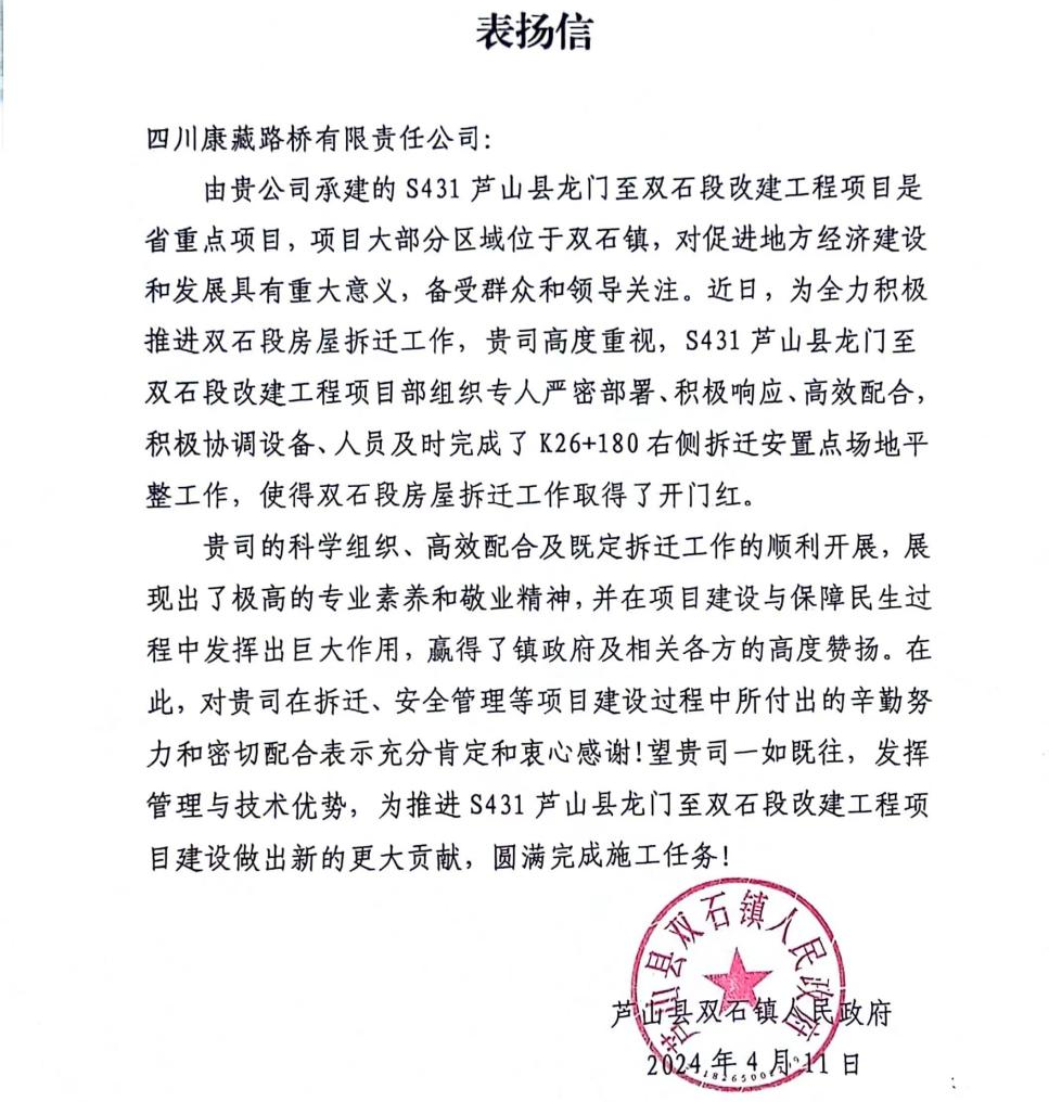 近日,雅安交建集團(tuán)四川康藏路橋有限責(zé)任公司收到來(lái)自蘆山縣雙石鎮(zhèn)人民政府的表?yè)P(yáng)信。信中對(duì)S431蘆山縣龍門至雙石段改建工程項(xiàng)目部積極協(xié)調(diào)設(shè)備、人員配合當(dāng)?shù)卣瓿蒏26+180右側(cè)拆遷安置點(diǎn)場(chǎng)地平整工作,使得雙石段房屋拆遷工作取得了開(kāi)門紅給予了高度評(píng)價(jià)和贊揚(yáng)。