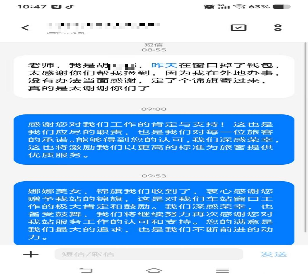 5月14日11時(shí)11分,售票員郝凌云發(fā)現(xiàn)柜臺(tái)上遺留了一個(gè)卡包,內(nèi)有現(xiàn)金 300 元、多張銀行卡、身份證及社?ǖ戎匾锲。郝凌云第一時(shí)間上報(bào)值班科長(zhǎng),通過站務(wù)系統(tǒng)比對(duì)購票信息,僅用5分鐘便鎖定失主為即將前往漢源的旅客胡女士,此時(shí)胡女士正在等待檢票,尚未察覺錢包丟失。值班站長(zhǎng)通過廣播系統(tǒng)緊急尋人,胡女士聽到廣播后立即前往值班室認(rèn)領(lǐng)物品,經(jīng)值班科長(zhǎng)仔細(xì)核對(duì)身份及物品信息后,將卡包完好歸還。胡女士激動(dòng)致謝:“太感謝你了!你們汽車站的工作人員素質(zhì)真高,太讓人暖心了!”