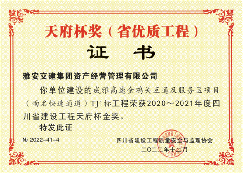 近日,雅安交建集團資產經營管理有限公司建設的成雅高速金雞關互通及服務區(qū)項目(雨名快速通道)TJ1標工程榮獲2020-2021年度四川省建設工程天府杯金獎。