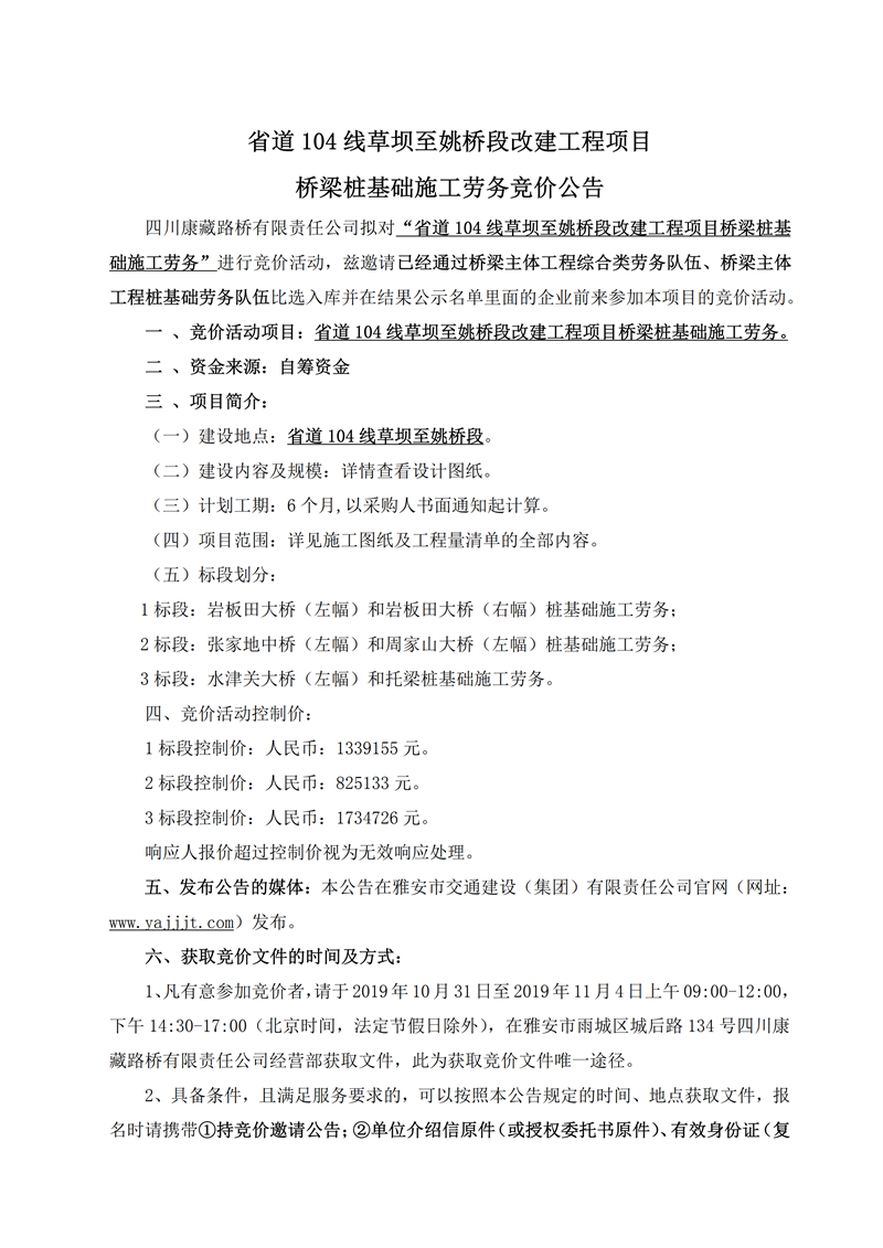 四川康藏路橋有限責任公司省道104線草壩至姚橋段改建工程項目橋梁樁基礎(chǔ)施工勞務(wù)競價公告