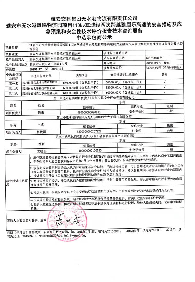 雅安交建集團(tuán)無(wú)水港物流有限責(zé)任公司雅安市無(wú)水港鳳鳴物流園項(xiàng)目110kv草城線兩次跨越雅眉樂(lè)高速的安全措施、應(yīng)急預(yù)案以及安全性技術(shù)評(píng)價(jià)報(bào)告技術(shù)咨詢服務(wù)中選承包商公示