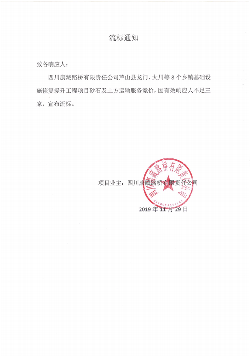四川康藏路橋有限責任公司蘆山縣龍門、大川等8個鄉(xiāng)鎮(zhèn)基礎設施恢復提升工程項目砂石及土方運輸服務競價流標通知