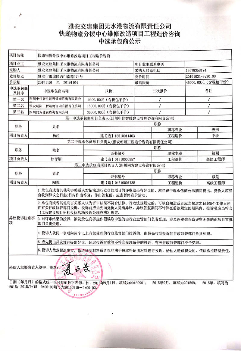 雅安交建集團無水港物流有限責任公司快遞物流分撥中心維修改造項目工程造價咨詢中選承包商公示