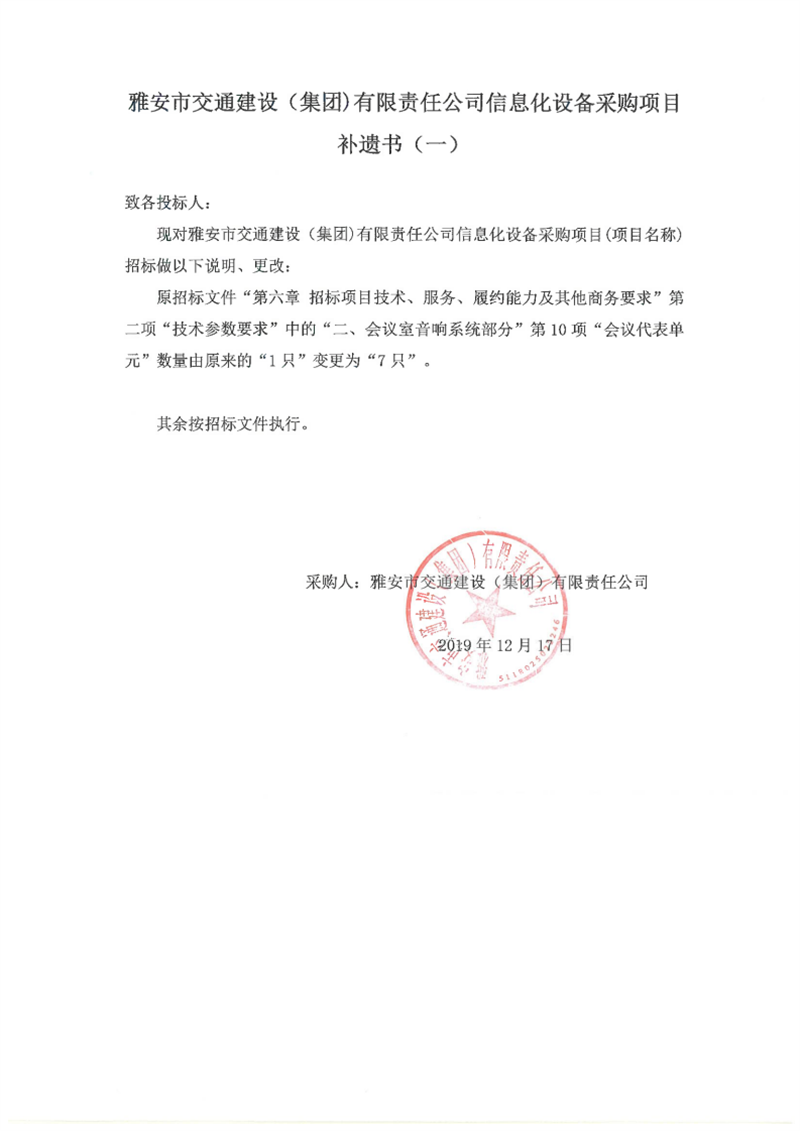 雅安市交通建設(shè)(集團(tuán))有限責(zé)任公司信息化設(shè)備采購(gòu)項(xiàng)目補(bǔ)遺書(shū)(一)