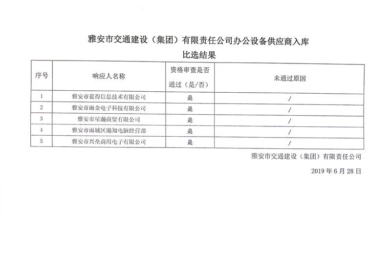 雅安市交通建設(集團)有限責任公司辦公設備供應商入庫比選結果