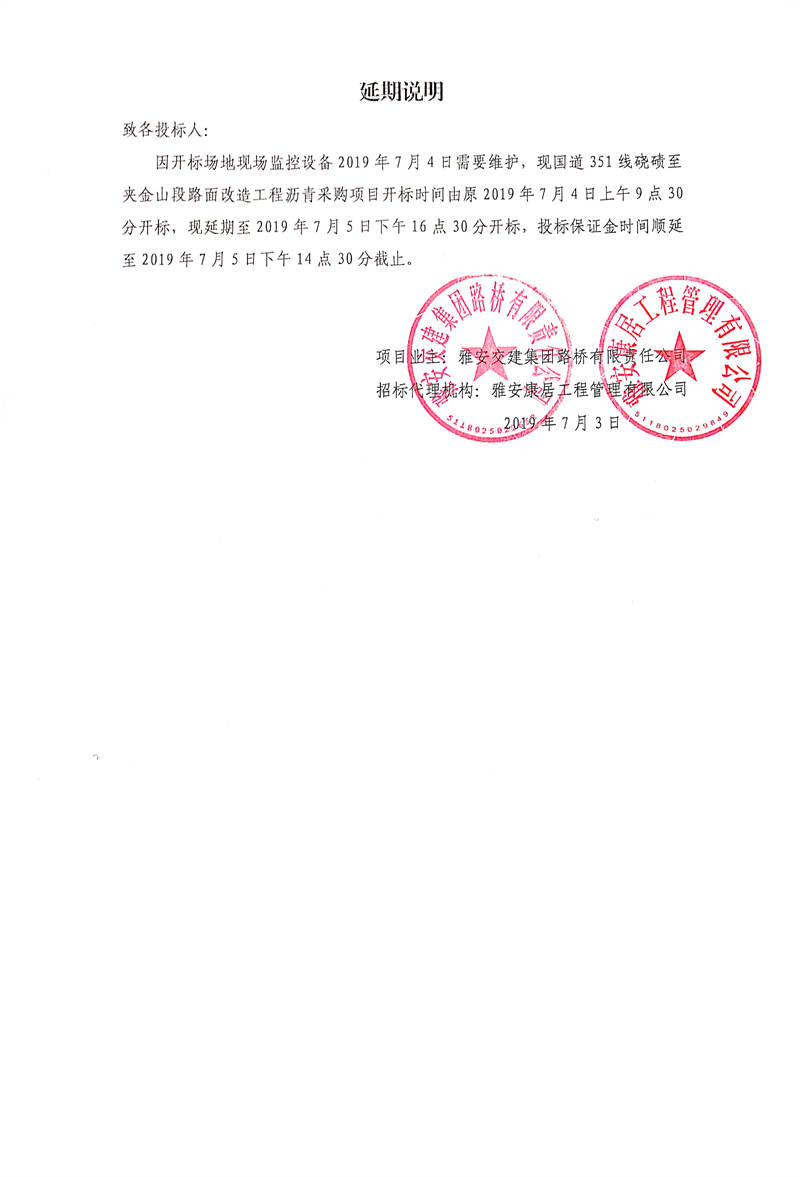 雅安交建集團路橋有限責(zé)任公司國道351線磽磧至夾金山段路面改造工程瀝青采購招標(biāo)延期說明