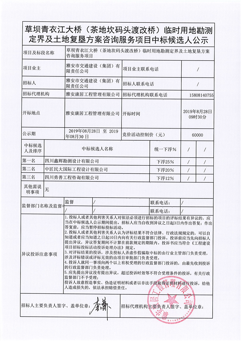 雅安市交通建設(shè)(集團(tuán))有限責(zé)任公司草壩青衣江大橋(茶地坎碼頭渡改橋)臨時用地勘測定界及土地復(fù)墾方案咨詢服務(wù)項(xiàng)目競價結(jié)果公示
