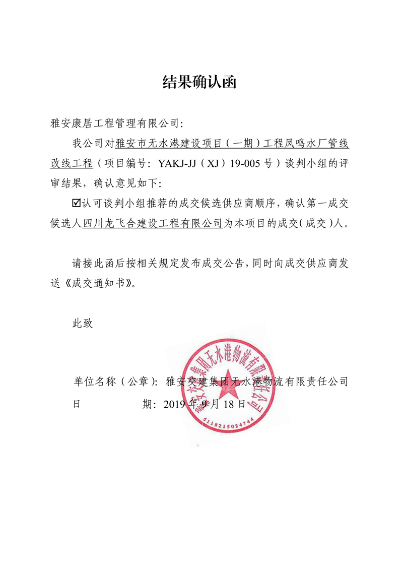 雅安交建集團無水港物流有限責任公司雅安市無水港建設項目(一期)工程鳳鳴水廠管線改線工程競爭性談判結果公示