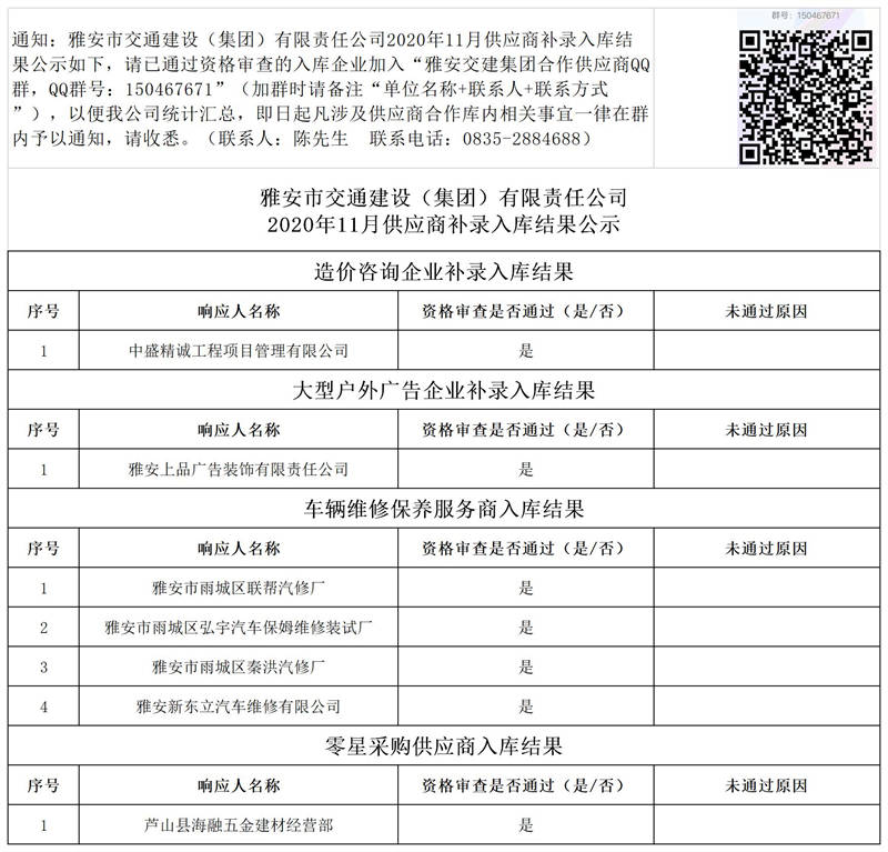 雅安市交通建設(集團)有限責任公司2020年11月供應商補錄入庫結(jié)果公示