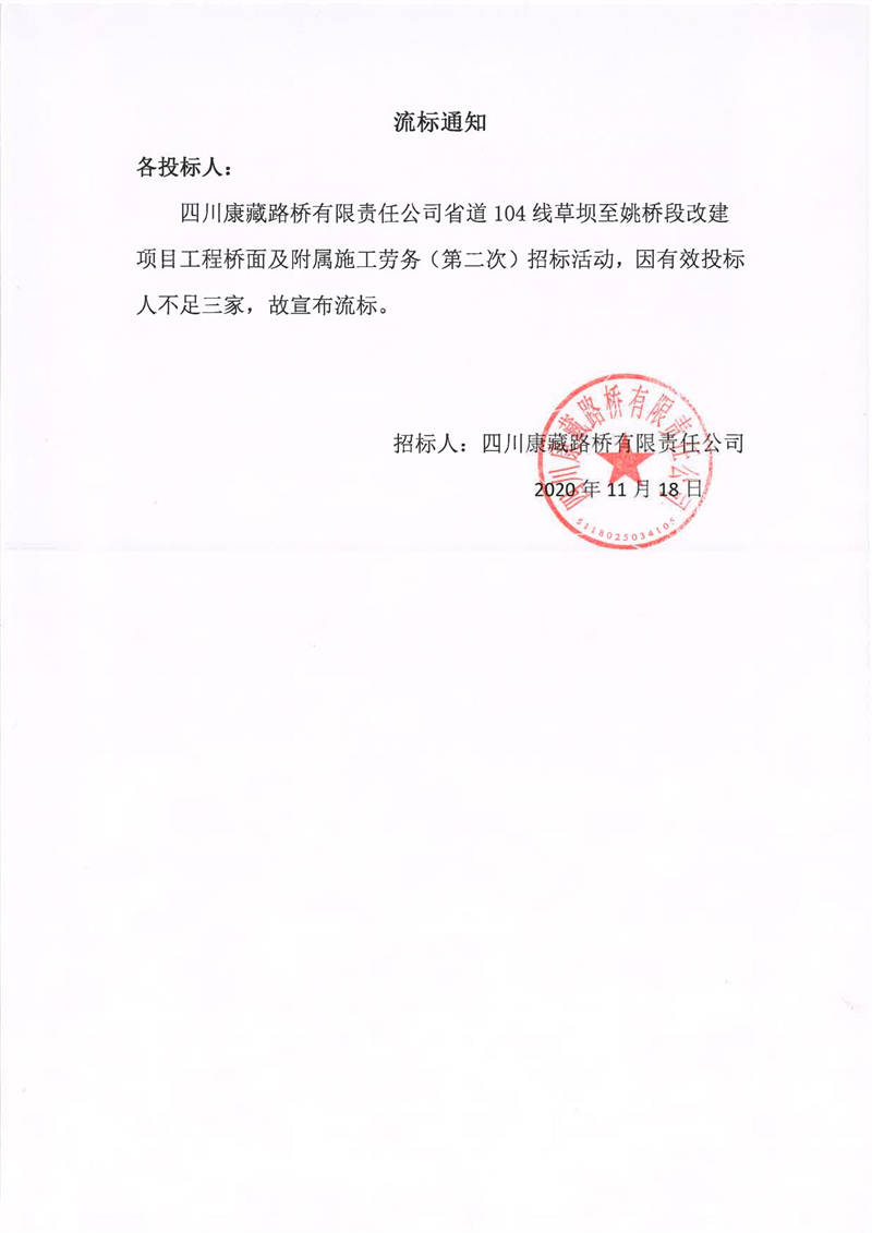 四川康藏路橋有限責(zé)任公司省道104線草壩至姚橋段改建項(xiàng)目工程橋面及附屬施工勞務(wù)(第二次)流標(biāo)通知