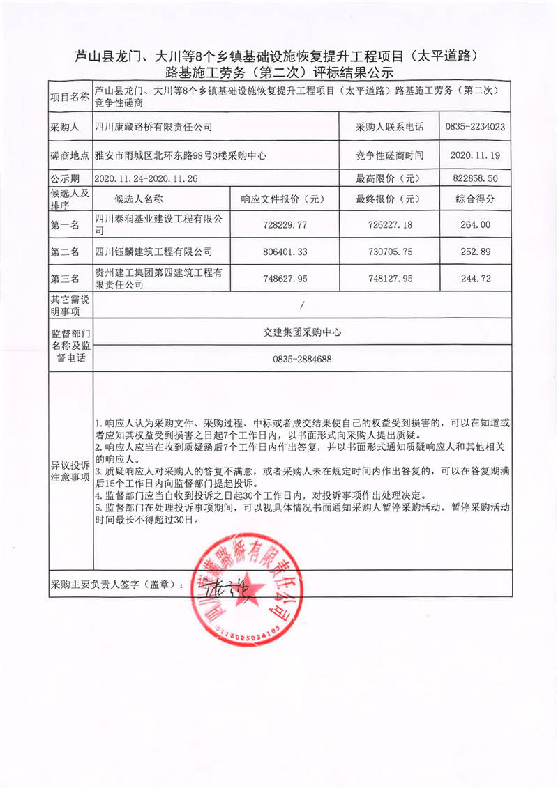 四川康藏路橋有限責(zé)任公司蘆山縣龍門、大川等8個鄉(xiāng)鎮(zhèn)基礎(chǔ)設(shè)施恢復(fù)提升工程項(xiàng)目(太平道路)路基施工勞務(wù)(第二次)評標(biāo)結(jié)果公示