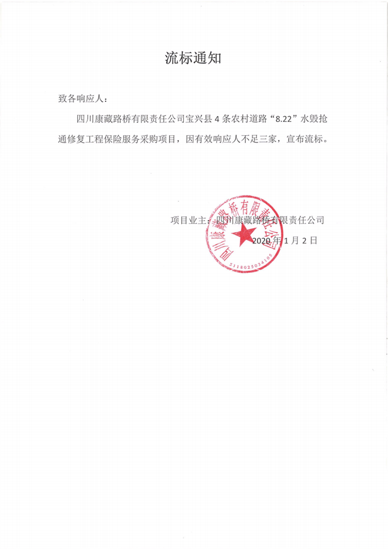 四川康藏路橋有限責(zé)任公司寶興縣4條農(nóng)村道路“8.22”水毀搶通修復(fù)工程保險(xiǎn)服務(wù)采購(gòu)項(xiàng)目流標(biāo)通知