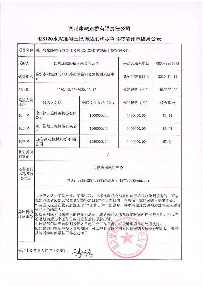 四川康藏路橋有限責(zé)任公司HZS120水泥混凝土攪拌站采購競(jìng)爭(zhēng)性磋商結(jié)果公示