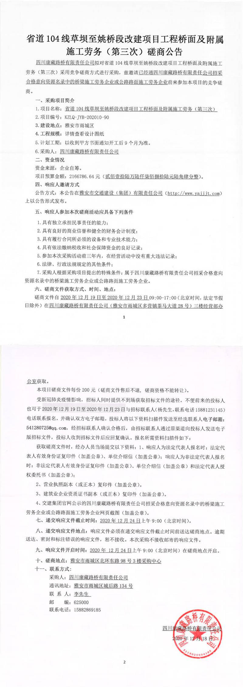四川康藏路橋有限責(zé)任公司省道104線草壩至姚橋段改建項目工程橋面及附屬施工勞務(wù)(第三次)磋商公告