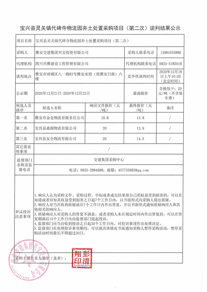 雅安交建集團興寶投資有限公司寶興縣靈關鎮(zhèn)代碑寺物流園棄土處置采購項目(第二次)談判結果公示