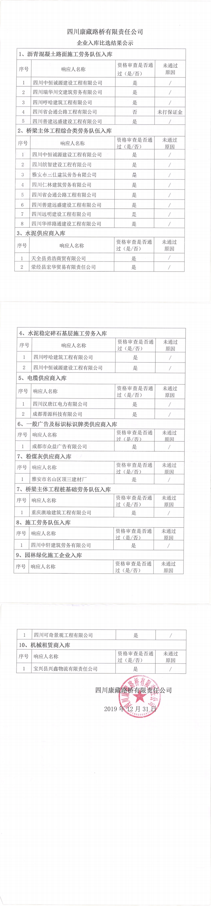 四川康藏路橋有限責(zé)任公司企業(yè)入庫比選結(jié)果公示