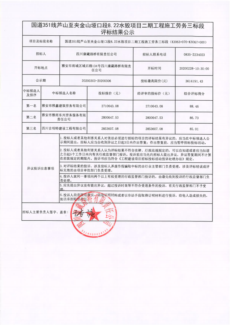 四川康藏路橋有限責任公司國道351線蘆山至夾金山埡口段8.22水毀項目二期工程施工勞務三標段評標結(jié)果公示