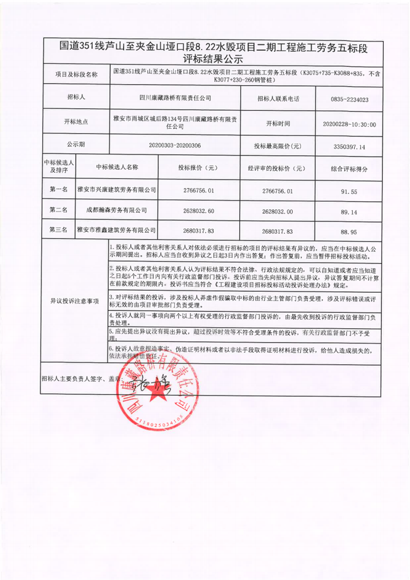 四川康藏路橋有限責(zé)任公司國(guó)道351線蘆山至夾金山埡口段8.22水毀項(xiàng)目二期工程施工勞務(wù)五標(biāo)段評(píng)標(biāo)結(jié)果公示