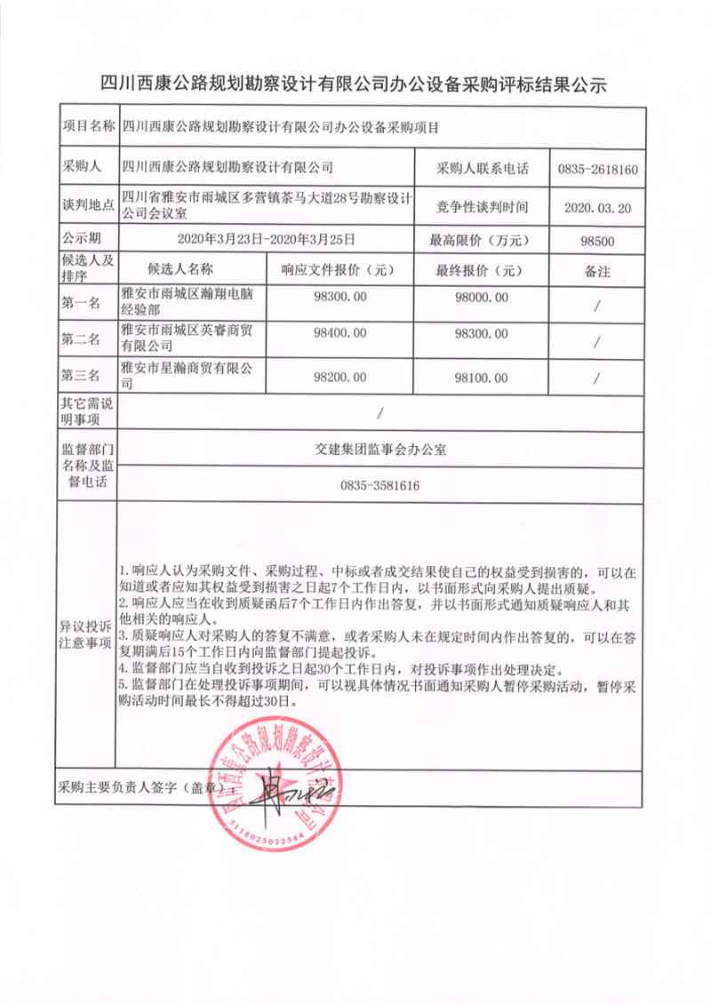 四川西康公路規(guī)劃勘察設(shè)計(jì)有限公司辦公設(shè)備采購(gòu)評(píng)標(biāo)結(jié)果公示
