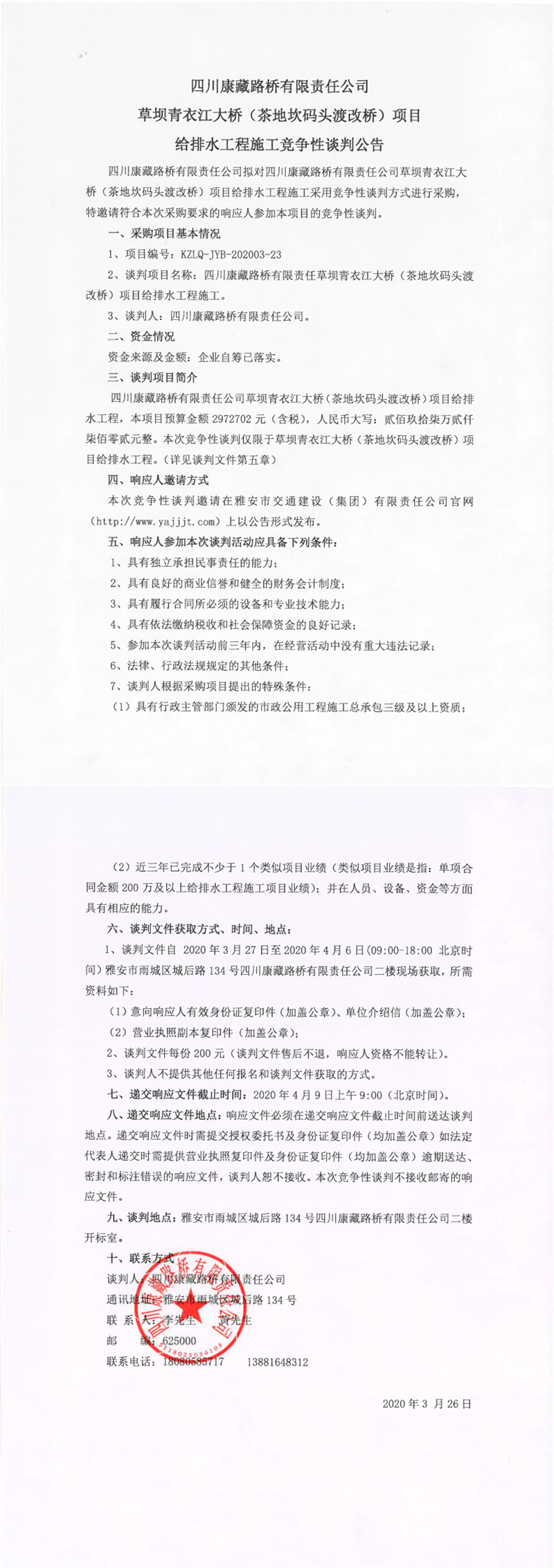 四川康藏路橋有限責(zé)任公司在建項(xiàng)目草壩青衣江大橋(茶地坎碼頭渡改橋)項(xiàng)目給排水工程施工競爭性談判公告
