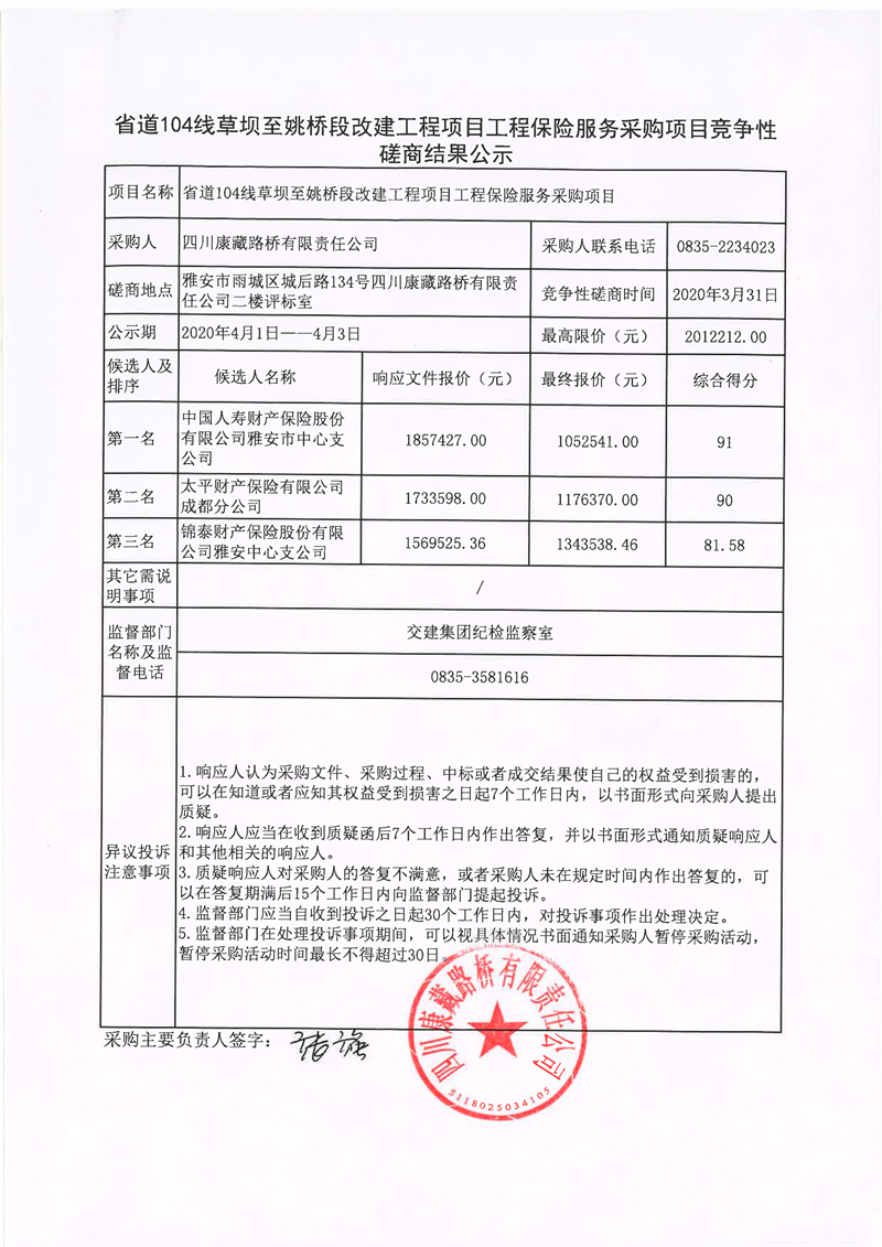 四川康藏路橋有限責(zé)任公司省道104線草壩至姚橋段改建工程項目工程保險服務(wù)采購項目競爭性磋商結(jié)果公示