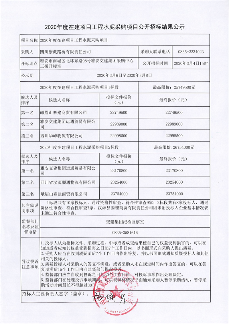 四川康藏路橋有限責(zé)任公司2020年度在建項目工程水泥采購項目公開招標結(jié)果公示