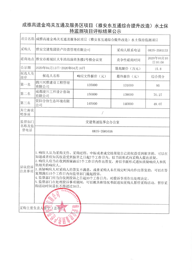 雅安交建集團資產(chǎn)經(jīng)營管理有限公司成雅高速金雞關(guān)互通及服務(wù)區(qū)項目(雅安東互通綜合提升改造)水土保持監(jiān)測項目評標結(jié)果公示