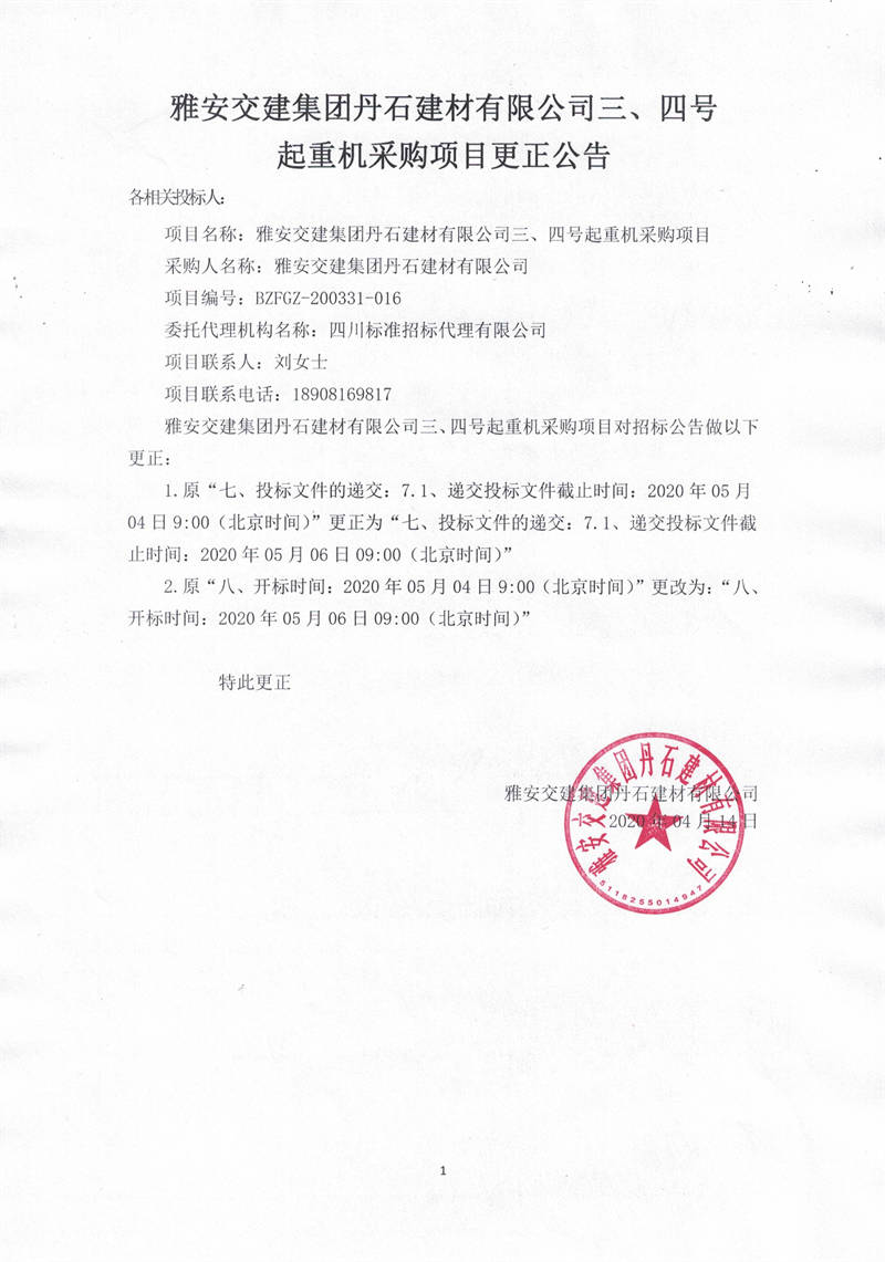 雅安交建集團(tuán)丹石建材有限公司三、四號(hào)起重機(jī)采購項(xiàng)目更正公告