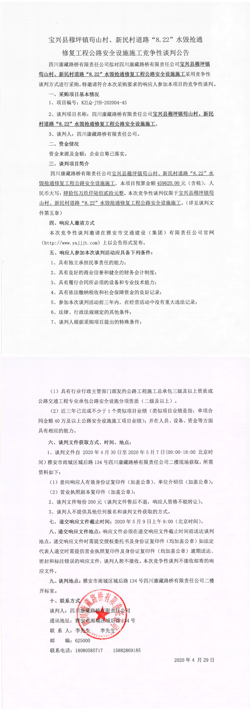 四川康藏路橋有限責(zé)任公司寶興縣穆坪鎮(zhèn)茍山村、新民村道路“8.22”水毀搶通修復(fù)工程公路安全設(shè)施施工競(jìng)爭(zhēng)性談判公告