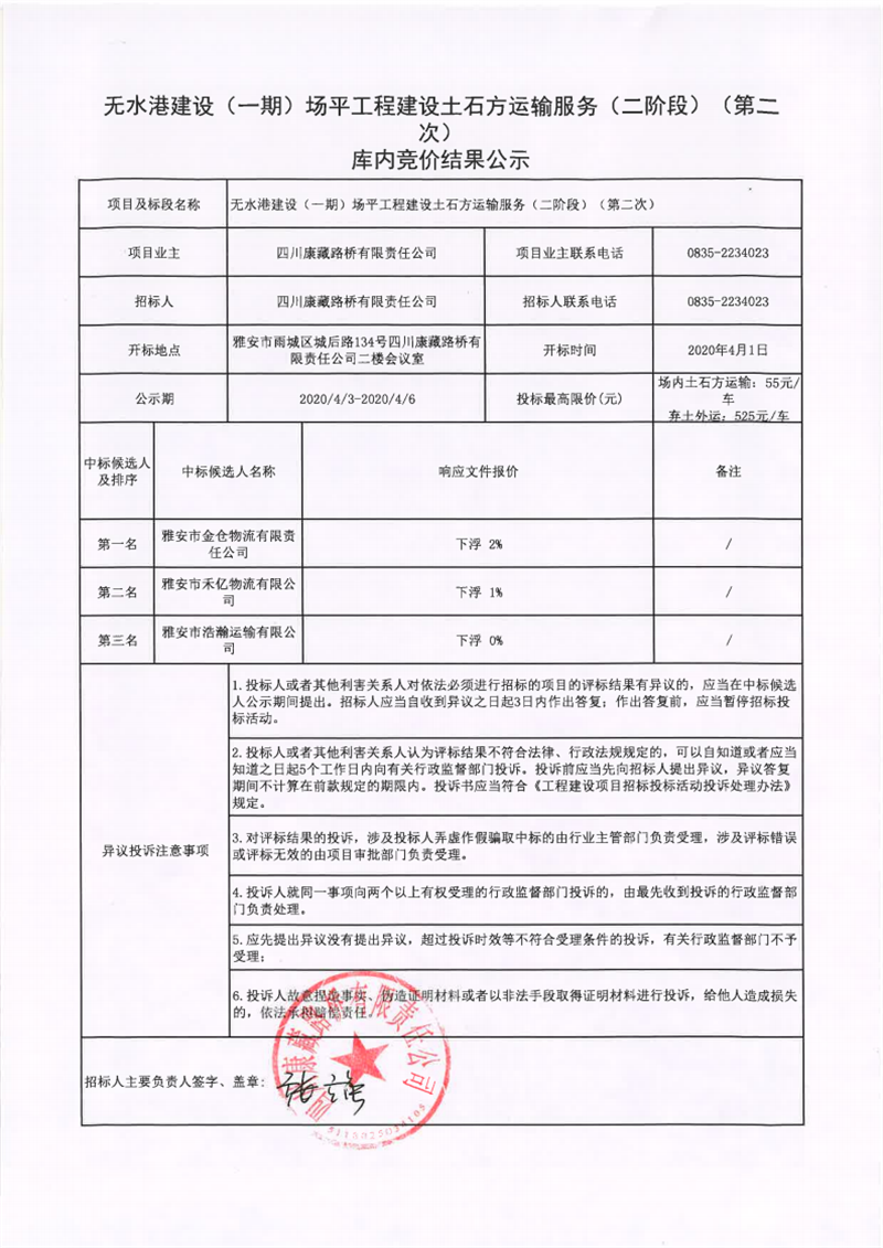 四川康藏路橋有限責(zé)任公司無水港建設(shè)(一期)場平工程土石方運(yùn)輸服務(wù)(二階段)(第二次)庫內(nèi)競價結(jié)果公示