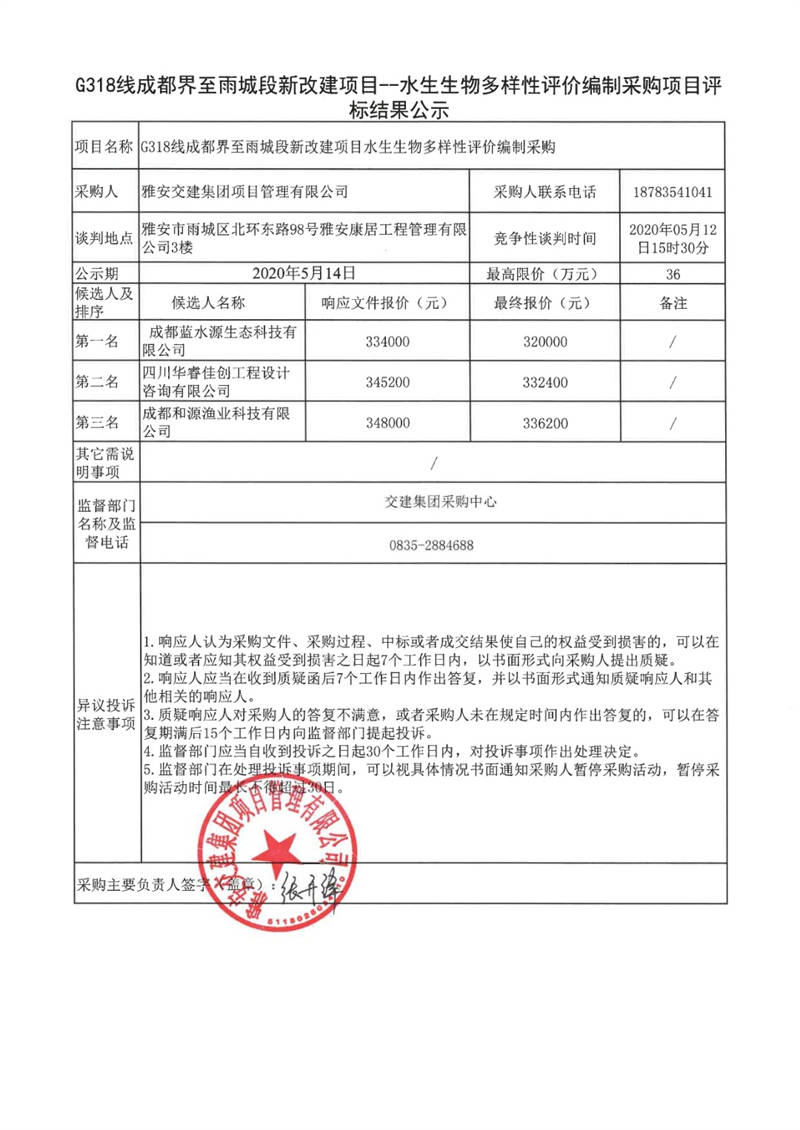 雅安交建集團(tuán)項(xiàng)目管理有限公司G318線成都界至雨城段新改建項(xiàng)目水生生物多樣性評價編制采購項(xiàng)目評標(biāo)結(jié)果公示