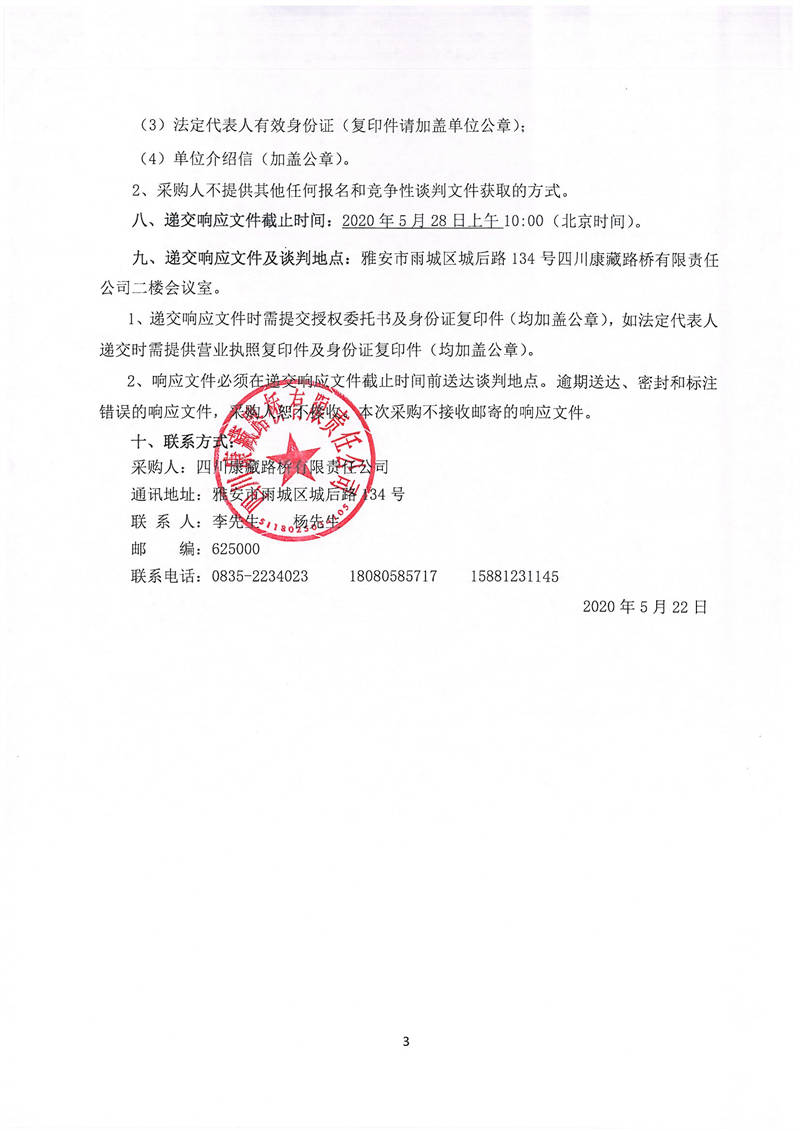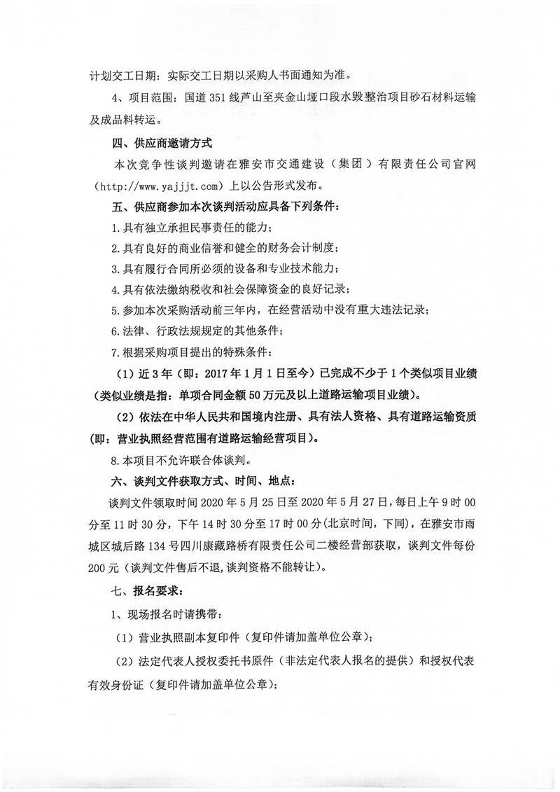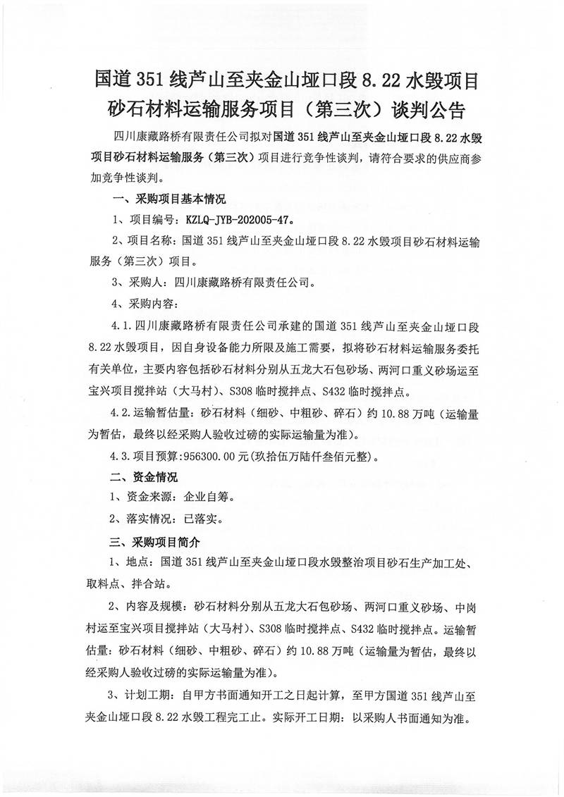 四川康藏路橋有限責(zé)任公司國(guó)道351線(xiàn)蘆山至夾金山埡口段8.22水毀項(xiàng)目砂石材料運(yùn)輸服務(wù)項(xiàng)目(第三次)談判公告