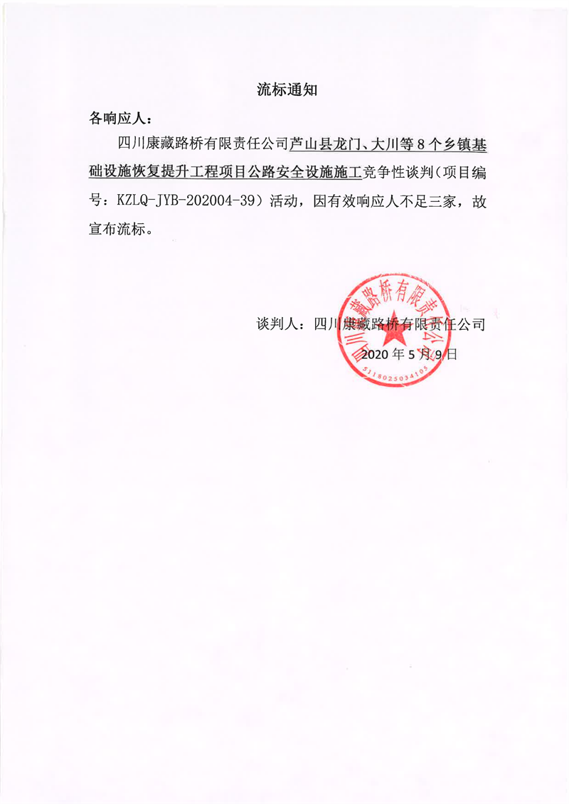 四川康藏路橋有限責(zé)任公司蘆山縣龍門、大川等8個(gè)鄉(xiāng)鎮(zhèn)基礎(chǔ)設(shè)施恢復(fù)提升工程項(xiàng)目公路安全設(shè)施施工競爭性談判流標(biāo)通知