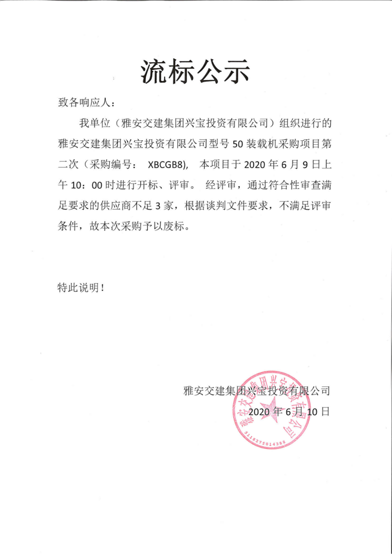 雅安交建集團(tuán)興寶投資有限公司型號(hào)50裝載機(jī)采購(gòu)項(xiàng)目第二次流標(biāo)公示