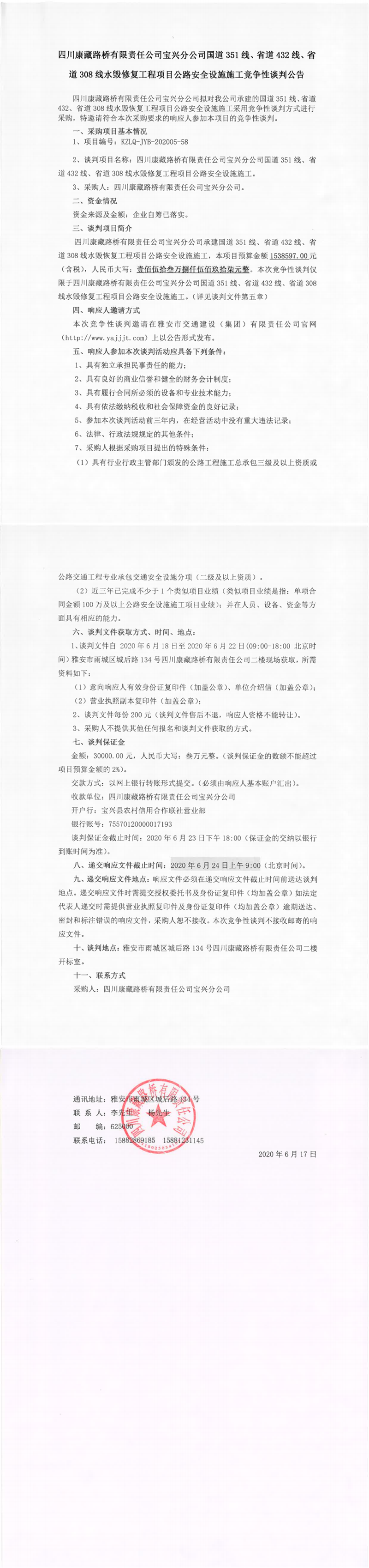 四川康藏路橋有限責任公司寶興分公司國道351線、省道432線、省道308線水毀修復工程項目公路安全設施施工競爭性談判公告
