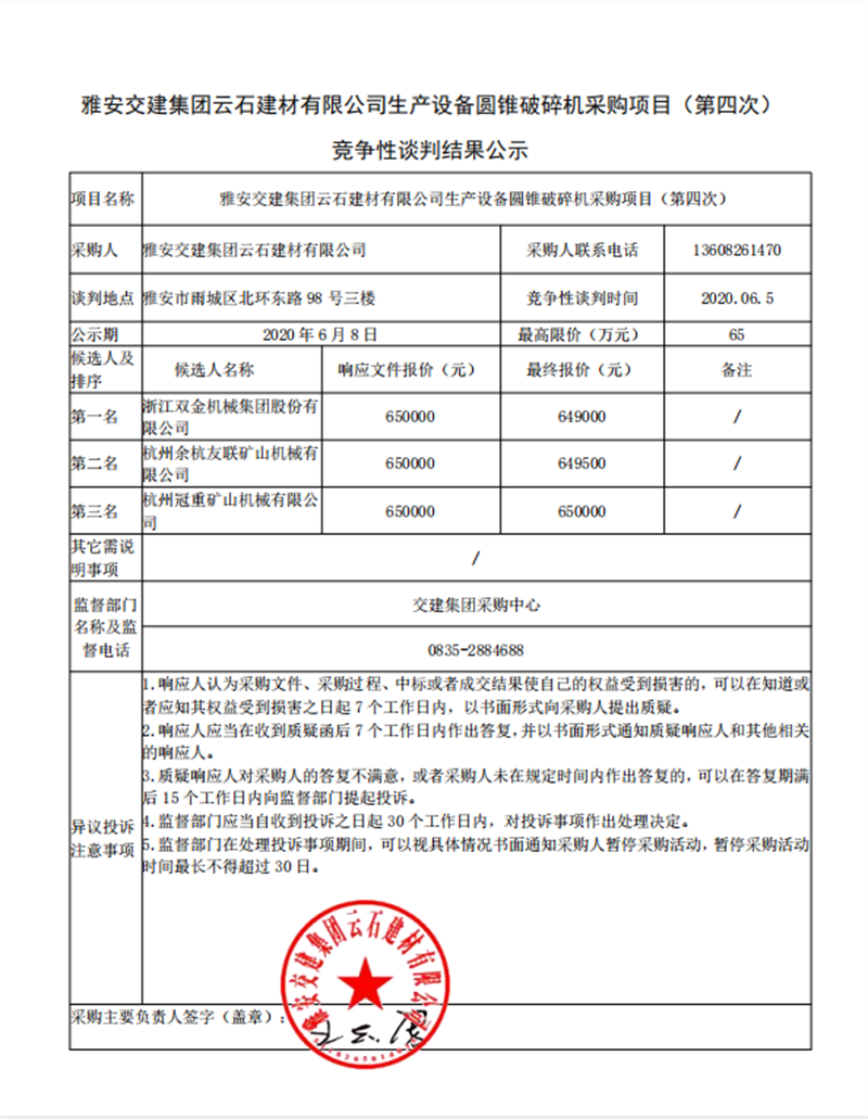 雅安交建集團(tuán)云石建材有限公司生產(chǎn)設(shè)備圓錐破碎機(jī)采購(gòu)項(xiàng)目(第四次)競(jìng)爭(zhēng)性談判結(jié)果公示