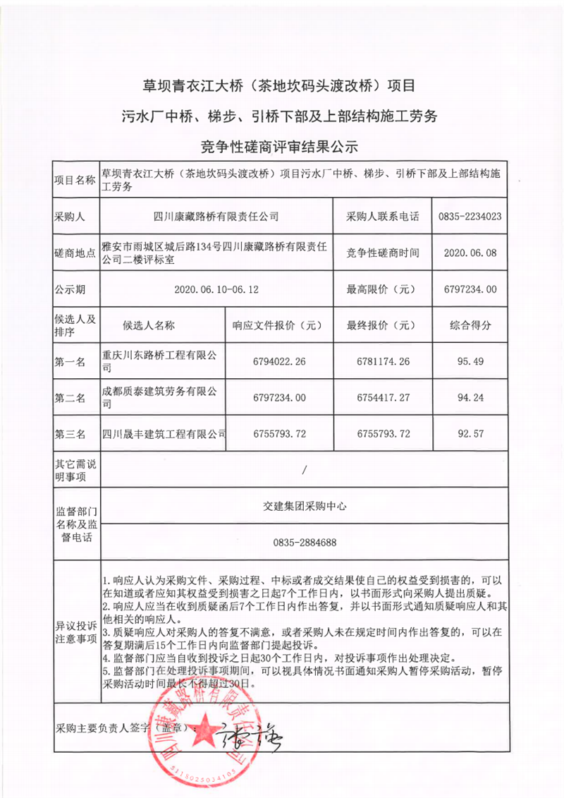 四川康藏路橋有限責任公司草壩青衣江大橋(茶地坎碼頭渡改橋)項目污水廠中橋、梯步、引橋下部及上部結(jié)構(gòu)施工勞務競爭性磋商評審結(jié)果公示