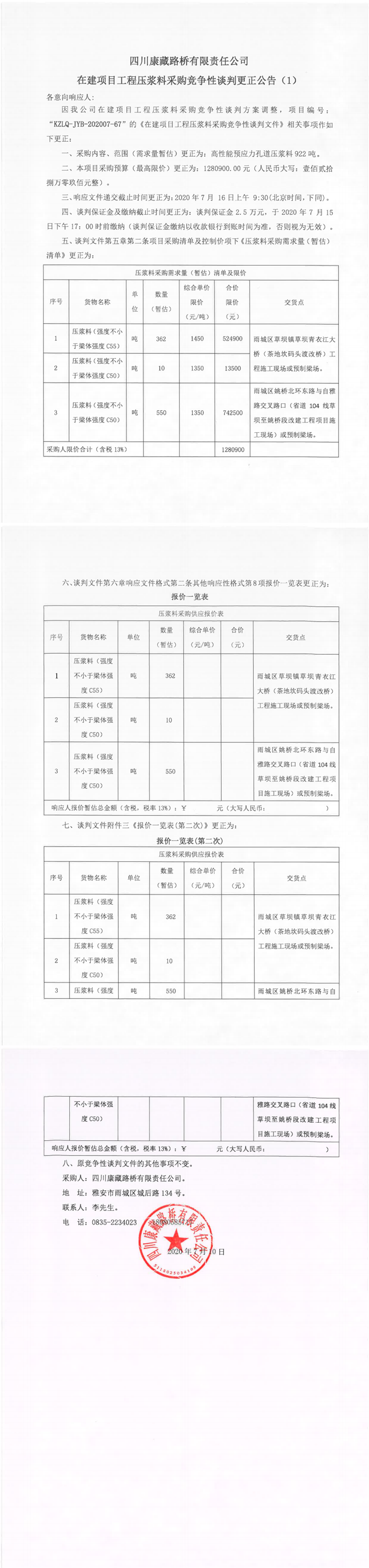 四川康藏路橋有限責(zé)任公司在建項(xiàng)目工程壓漿料采購競(jìng)爭(zhēng)性談判更正公告(1)