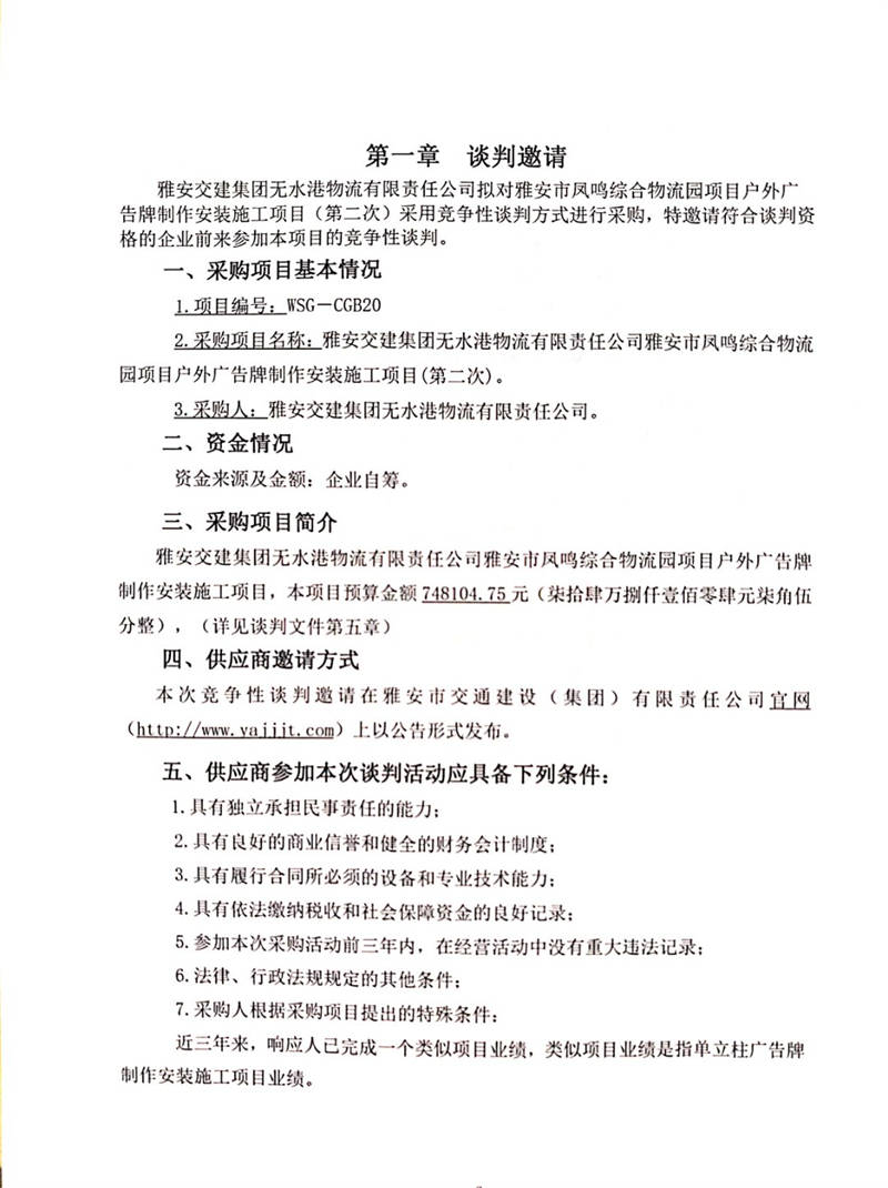 雅安交建集團無水港物流有限責任公司雅安市鳳鳴綜合物流園項目戶外廣告牌制作安裝施工項目(第二次)競爭性談判公告