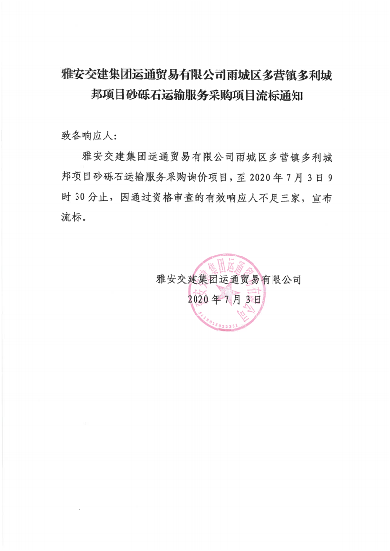 雅安交建集團(tuán)運(yùn)通貿(mào)易有限公司雨城區(qū)多營鎮(zhèn)多利城邦項目砂礫石運(yùn)輸服務(wù)采購項目流標(biāo)通知