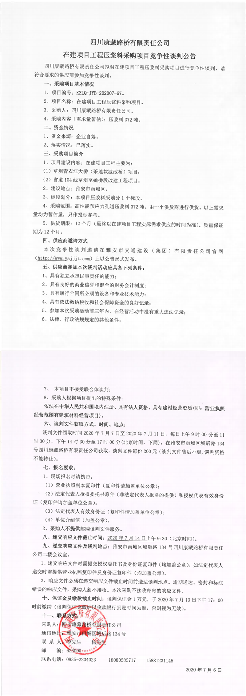 四川康藏路橋有限責(zé)任公司在建項(xiàng)目工程壓漿料采購(gòu)項(xiàng)目競(jìng)爭(zhēng)性談判公告
