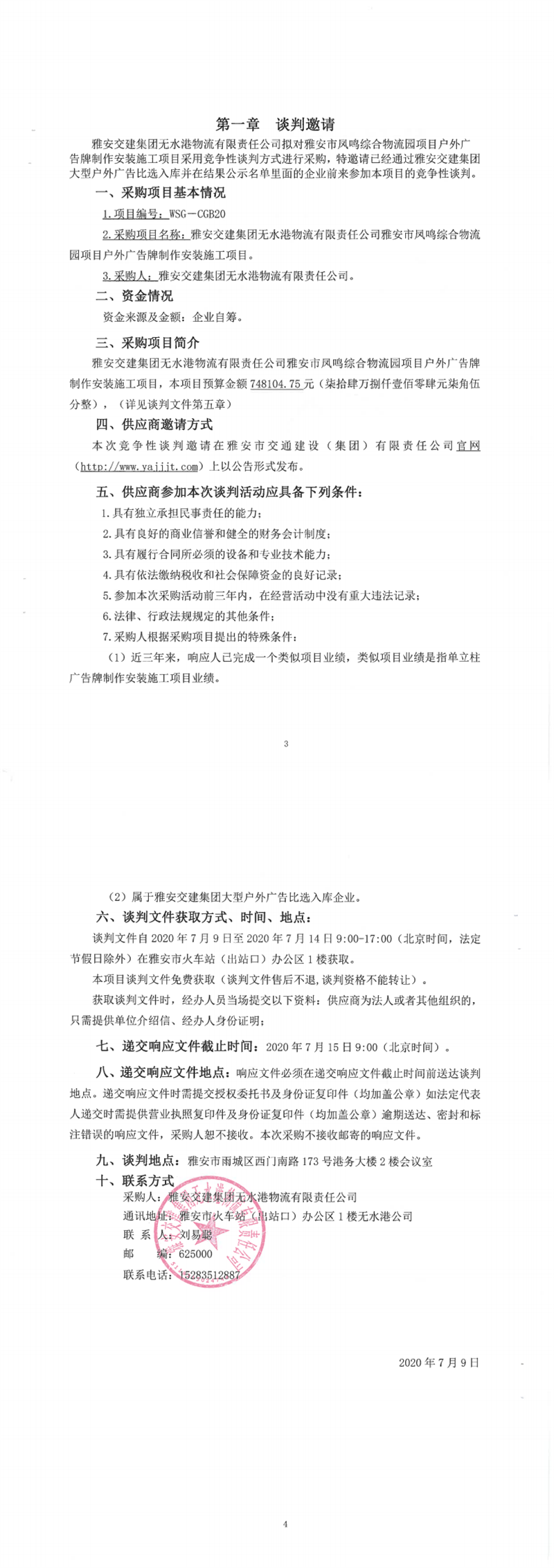 雅安交建集團無水港物流有限責任公司雅安市鳳鳴綜合物流園項目戶外廣告牌制作安裝施工項目競爭性談判公告