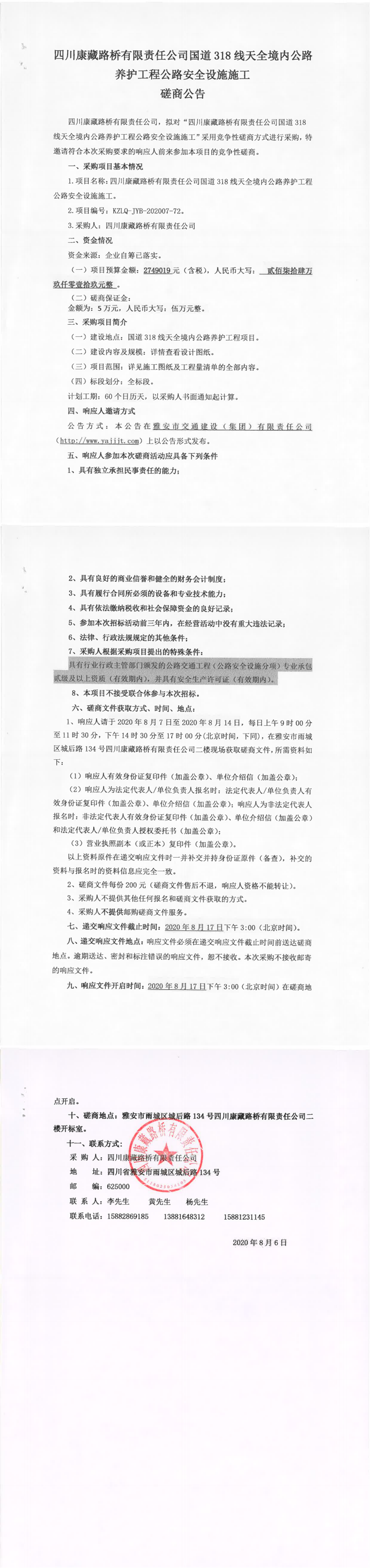 四川康藏路橋有限責任公司國道318線天全境內公路養(yǎng)護工程公路安全設施施工磋商公告