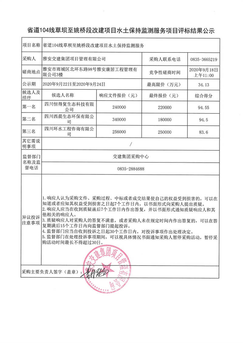 雅安交建集團(tuán)項目管理有限公司省道104線草壩至姚橋段改建項目水土保持監(jiān)測服務(wù)項目評標(biāo)結(jié)果公示