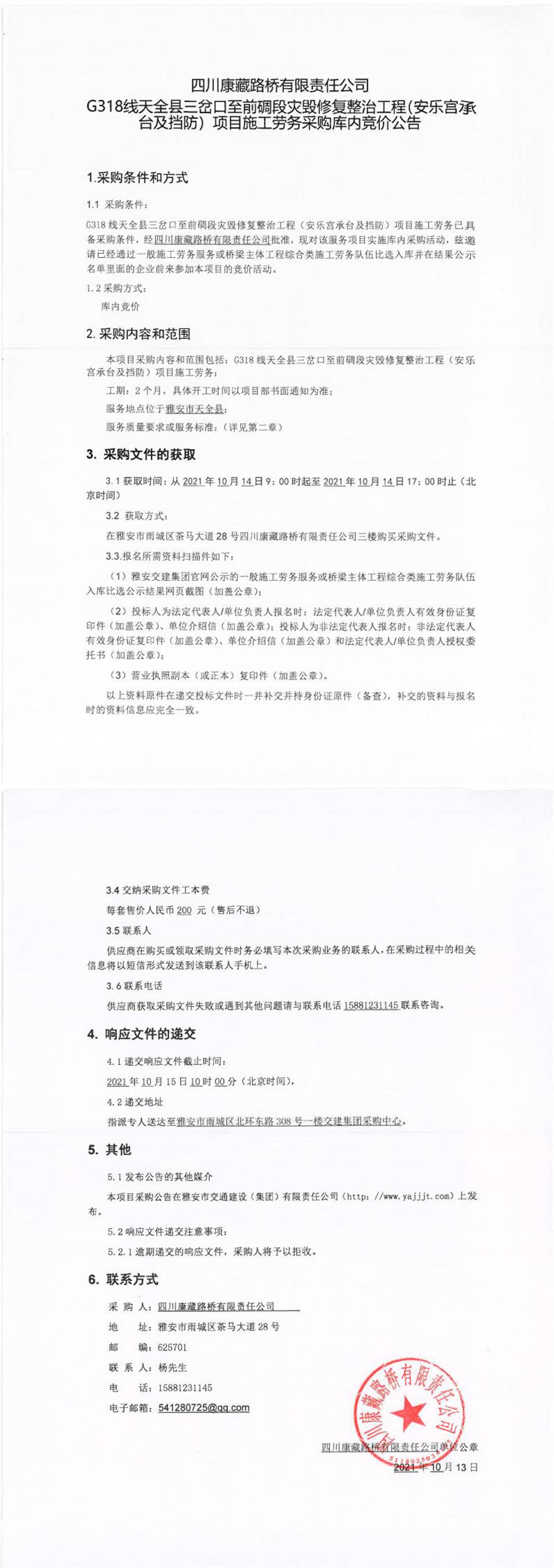 四川康藏路橋有限責任公司G318線天全縣三岔口至前碉段災毀修復整治工程(安樂宮承臺及擋防)項目施工勞務采購庫內競價公告
