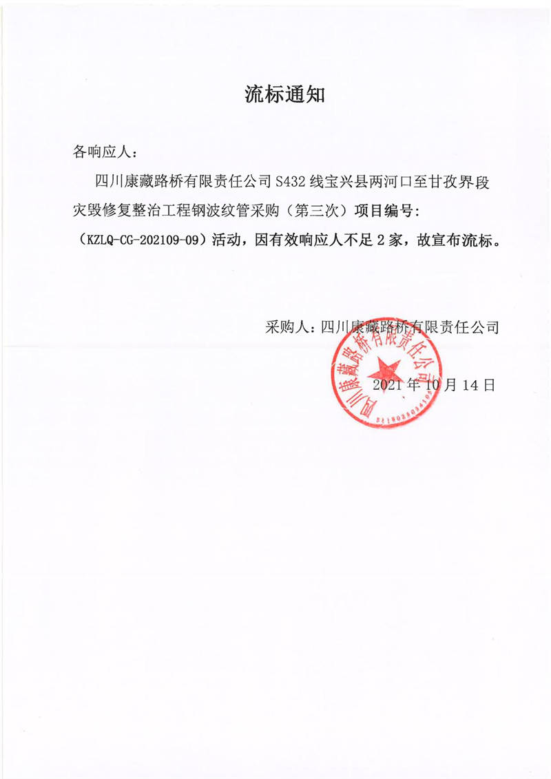 四川康藏路橋有限責(zé)任公司S432線(xiàn)寶興縣兩河口至甘孜界段災(zāi)毀修復(fù)整治工程鋼波紋管采購(gòu)(第三次)競(jìng)價(jià)公告