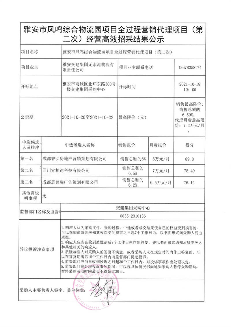 雅安交建集團(tuán)無水港物流有限責(zé)任公司雅安市鳳鳴綜合物流園項目全過程營銷代理項目(第二次)經(jīng)營高效招采結(jié)果公示